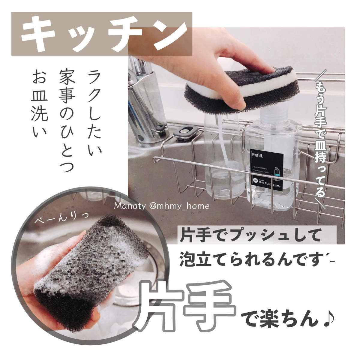 スポンジを持った片手でボトル上からプッシュして、そのまま泡立てることができるんです!もう片方の手でお皿持ったままできるので、洗剤を継ぎ足す際の地味な手間もなくなります♪