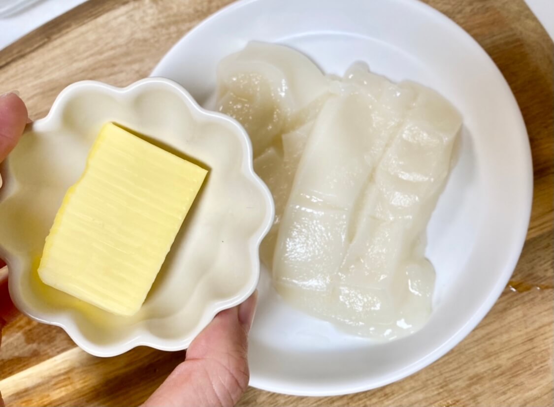 お餅が柔らかくなったら、水けを切ってお皿に移し、バターをのせて絡ませていきます!