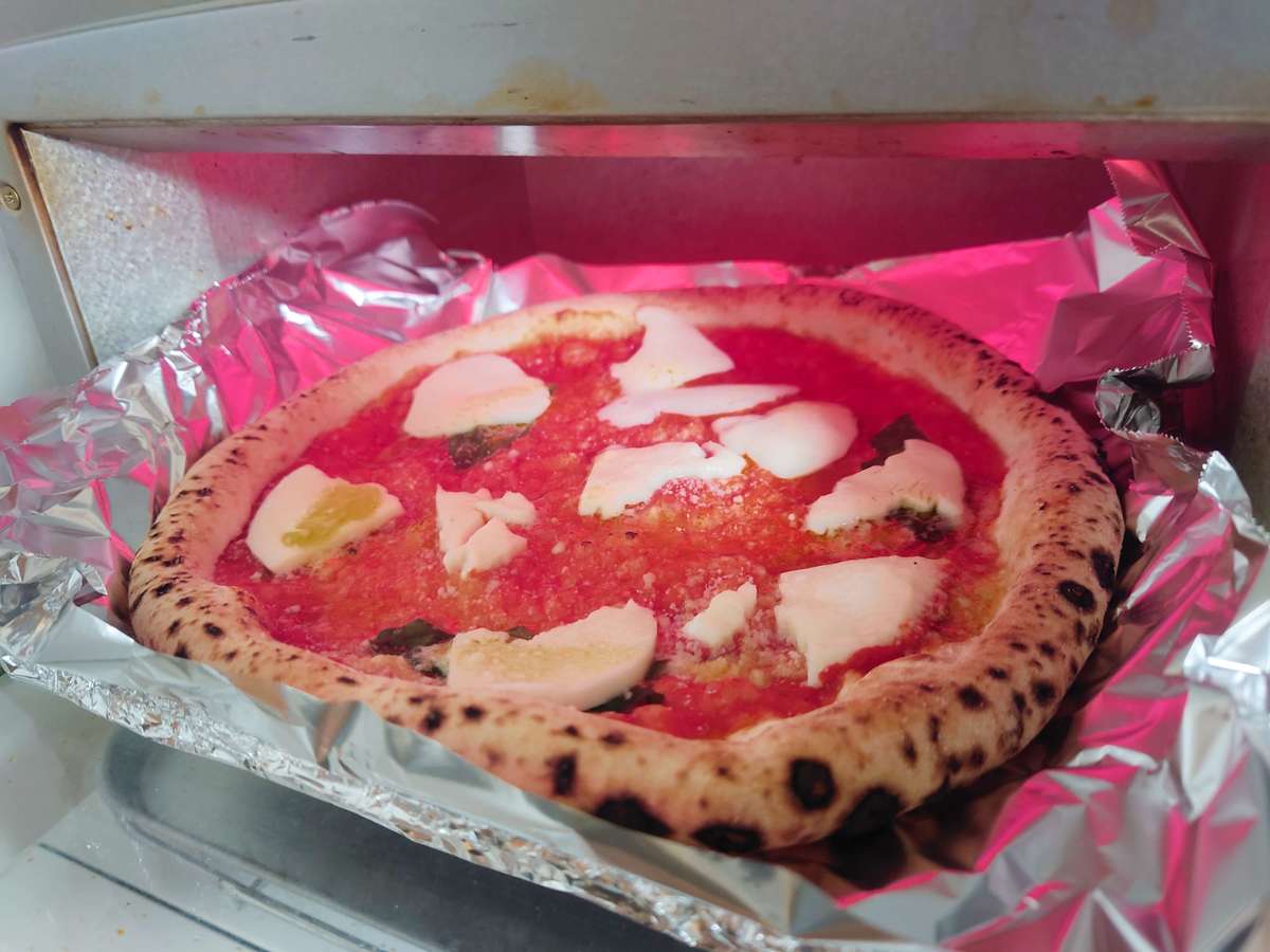 口の中でアツアツなチーズがとろけます。トマトソースの酸味が程よく、耳はモチモチ。生地の薄さも調度良いです。