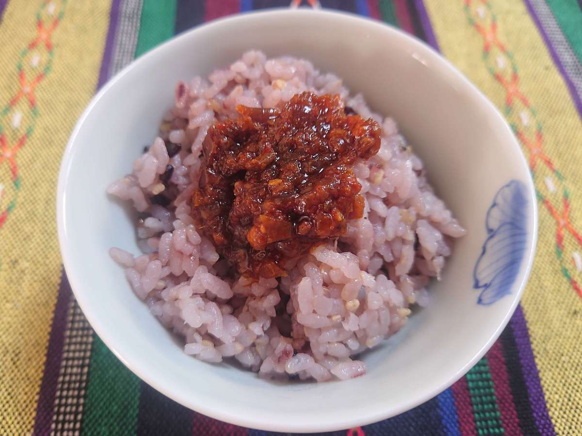 雑穀米にかけてみたら、本当に止まらなくなってしまいました。ごはんの熱さで肉みその味も引き立ちます。もちろん真っ白ごはんで食べてもおいしいですよ。