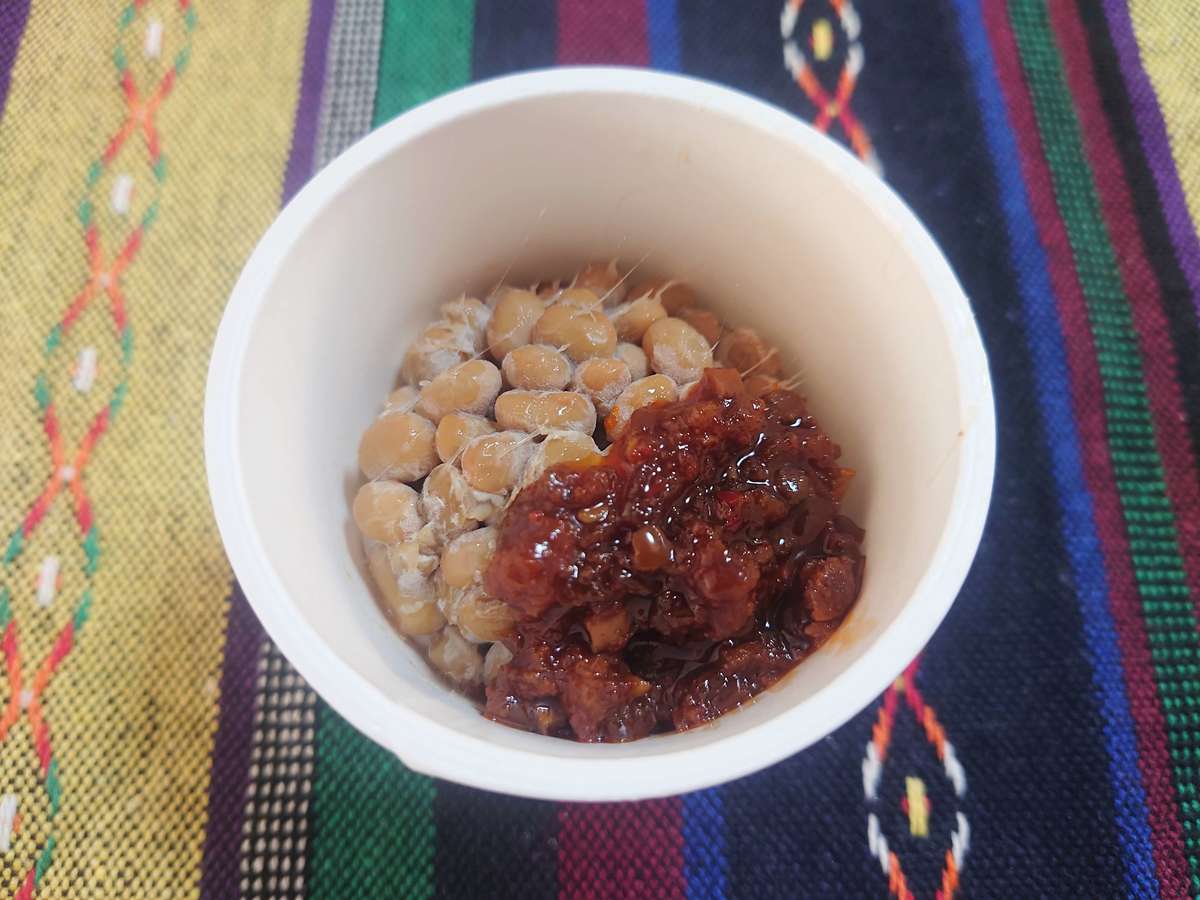 他に合わせておいしいものはないかと納豆と合わせてみました。納豆がピリ辛風味になり、粘り気に油分がうまく混ざって食べやすいです。納豆の風味と相性バッチリ!