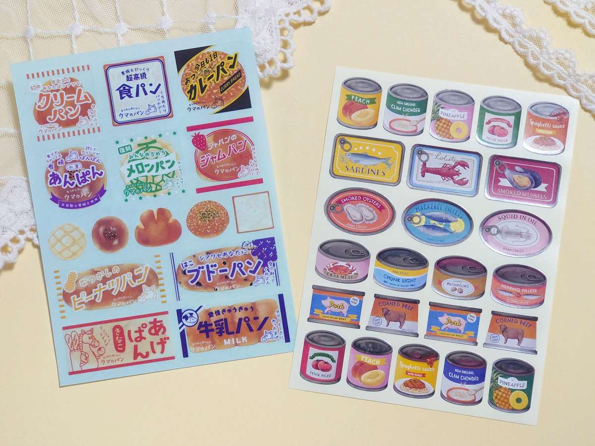 写真左は、"ウマのパン"というブランド名とウマのキャラクターが謎に面白いパンのシール。どのパンもコンビニやスーパーで見たことがあるような……(笑)、おいしそうと可愛いが同居したシールです。
