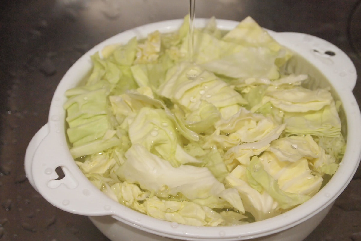 こちらは、最初にお好みの形状に切ってからボウルの上にザルを重ね、切ったキャベツを入れ、流水で洗います。