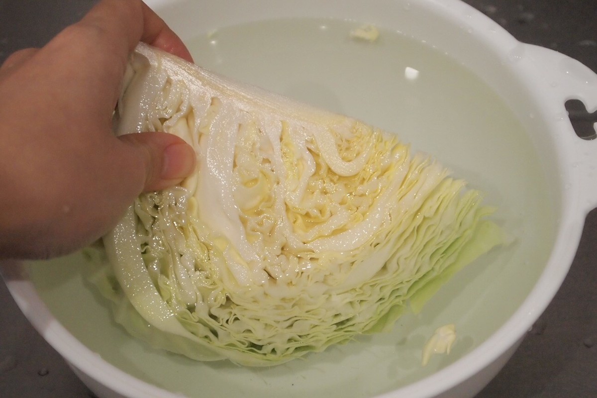 くし形に切ったキャベツは、水を張ったボウルの中で軽く揺するようにして洗うと、葉の間に水がしっかり入り、中の汚れも落ちますよ!