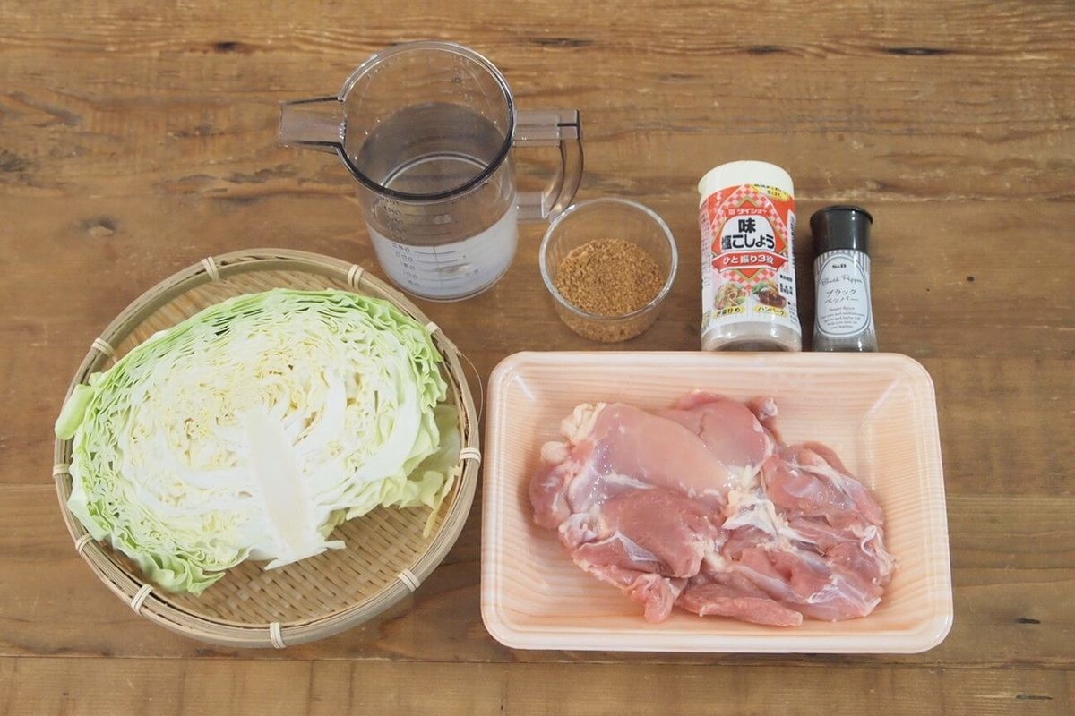 鍋に水・コンソメ・鶏肉・キャベツの順に入れ、沸騰するまで中火にかけます。