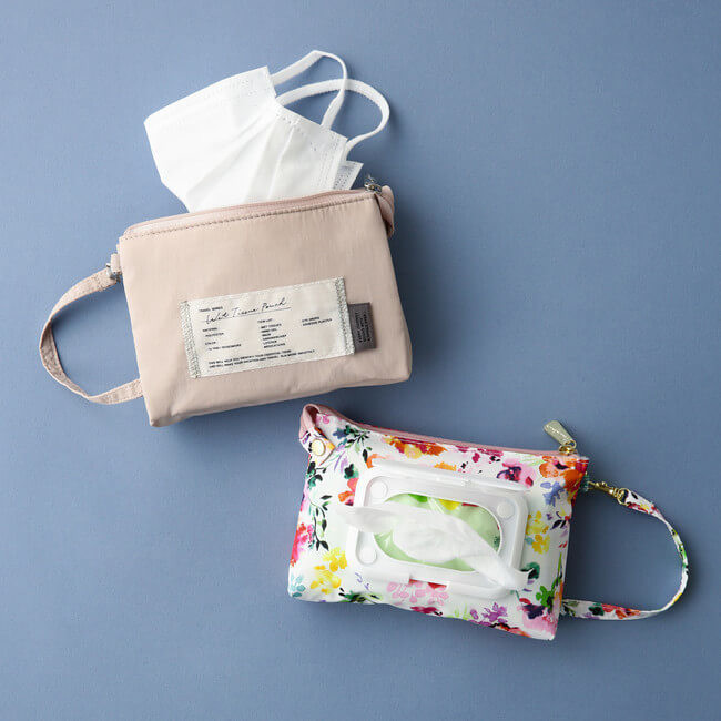 ケースの背面にウェットティッシュ、内側にはマスクを収納できる便利なポーチです。中には仕切りがあるので、マスクだけでなくアルコールジェルやリップクリームなどさっと取り出したいアイテムの収納にもおすすめです。ワンタッチで取り付けられるストラップ付き。