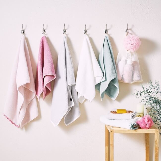 風合いの違う薄手と厚手のタオルのセットシリーズです。もっちりした厚手タイプは髪や体、顔の水分を摩擦レスで吸い取り、さっぱりの薄手タイプはマルチユースで活躍します。ハンガーに吊るして干せるスリムサイズで、フックに掛けられるループ付きが嬉しいポイント。