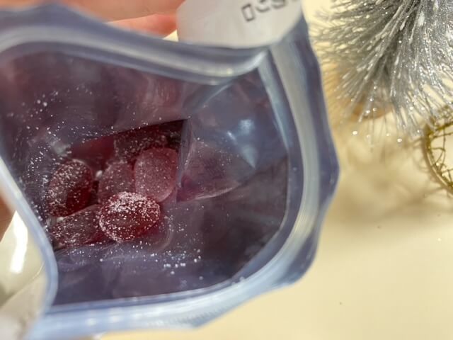 グミは想像通りの紫色で、表面にはきらきらと輝く粉末オブラートが。