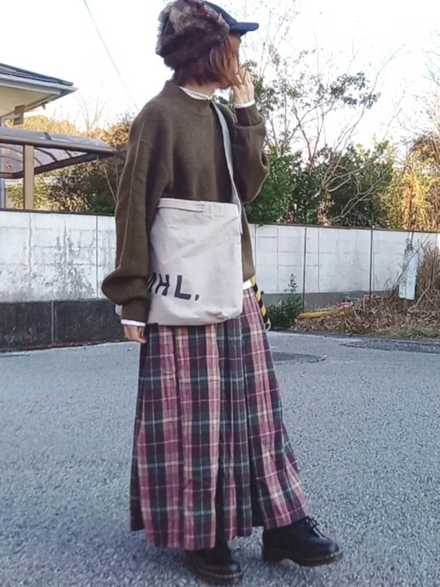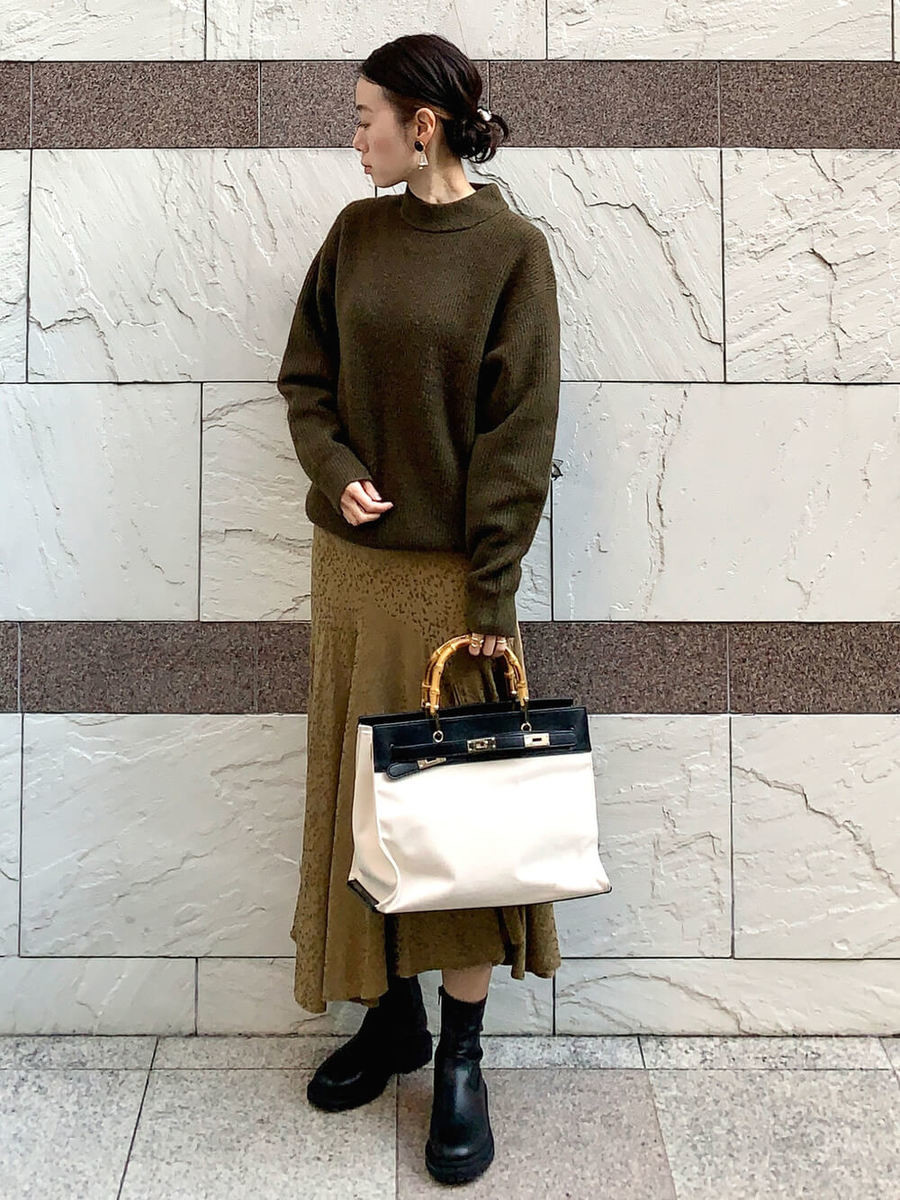 主張の強い柄スカートも、カーキニットなら大人仕様にまとめてくれます。