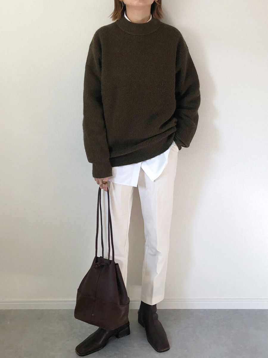 こちらのニットは、ネイビーやカーキ、ブラウンみの強いナチュラルがおすすめですが、今回はそのなかでもカーキの着こなしを紹介します。