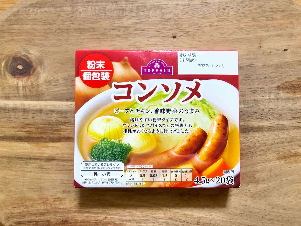 コンソメは4.5gずつ個包装されているものが20個入っています。ビーフチキンと香味野菜のうまみをとじこめた、オーソドックスなコンソメです。なのになぜこんなにポテトと相性がいいのか。