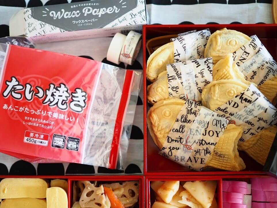 さらに、同じく業務スーパーで販売されているたい焼き(278円)を使って、おめでたいスイーツの重も追加してみるのはいかがでしょうか。
