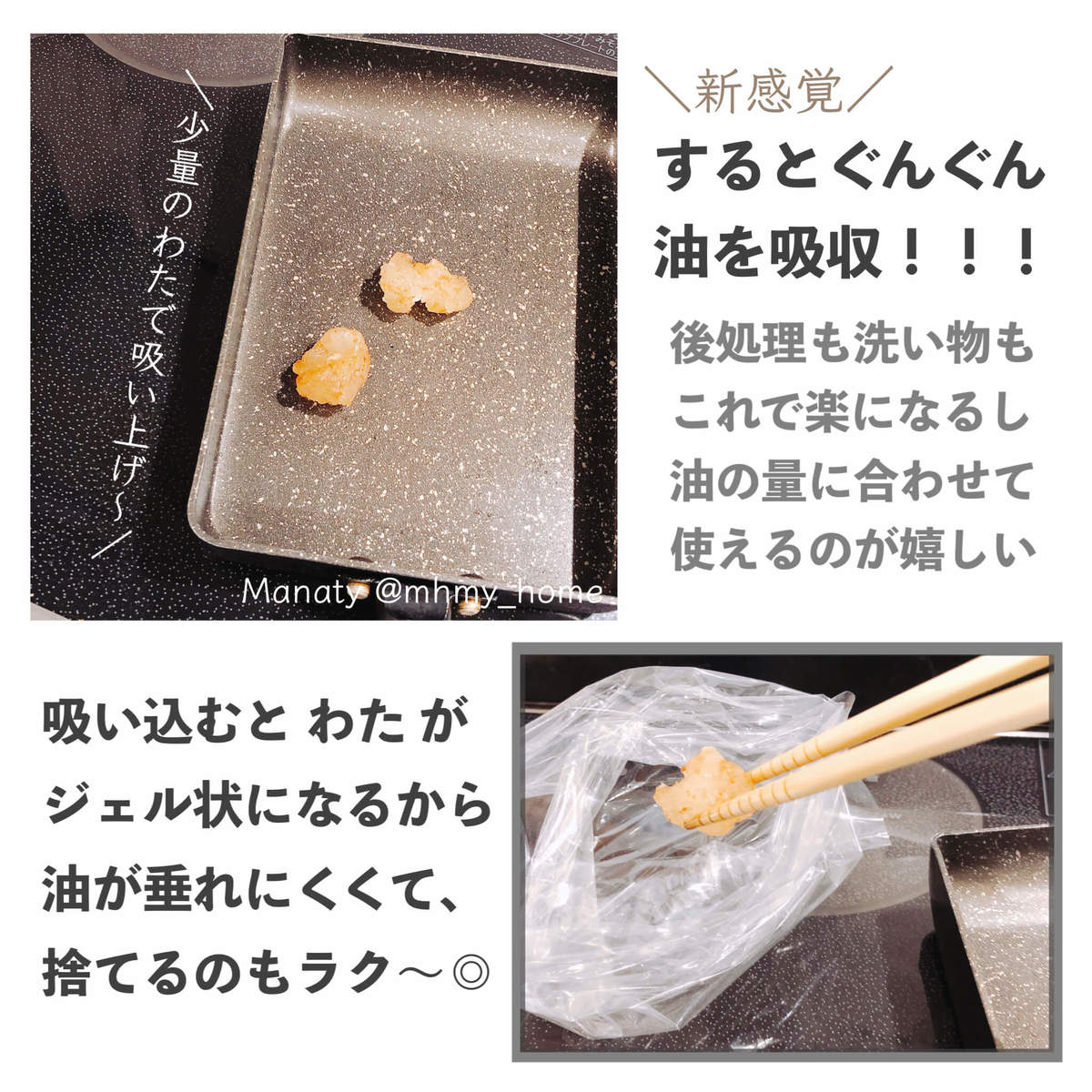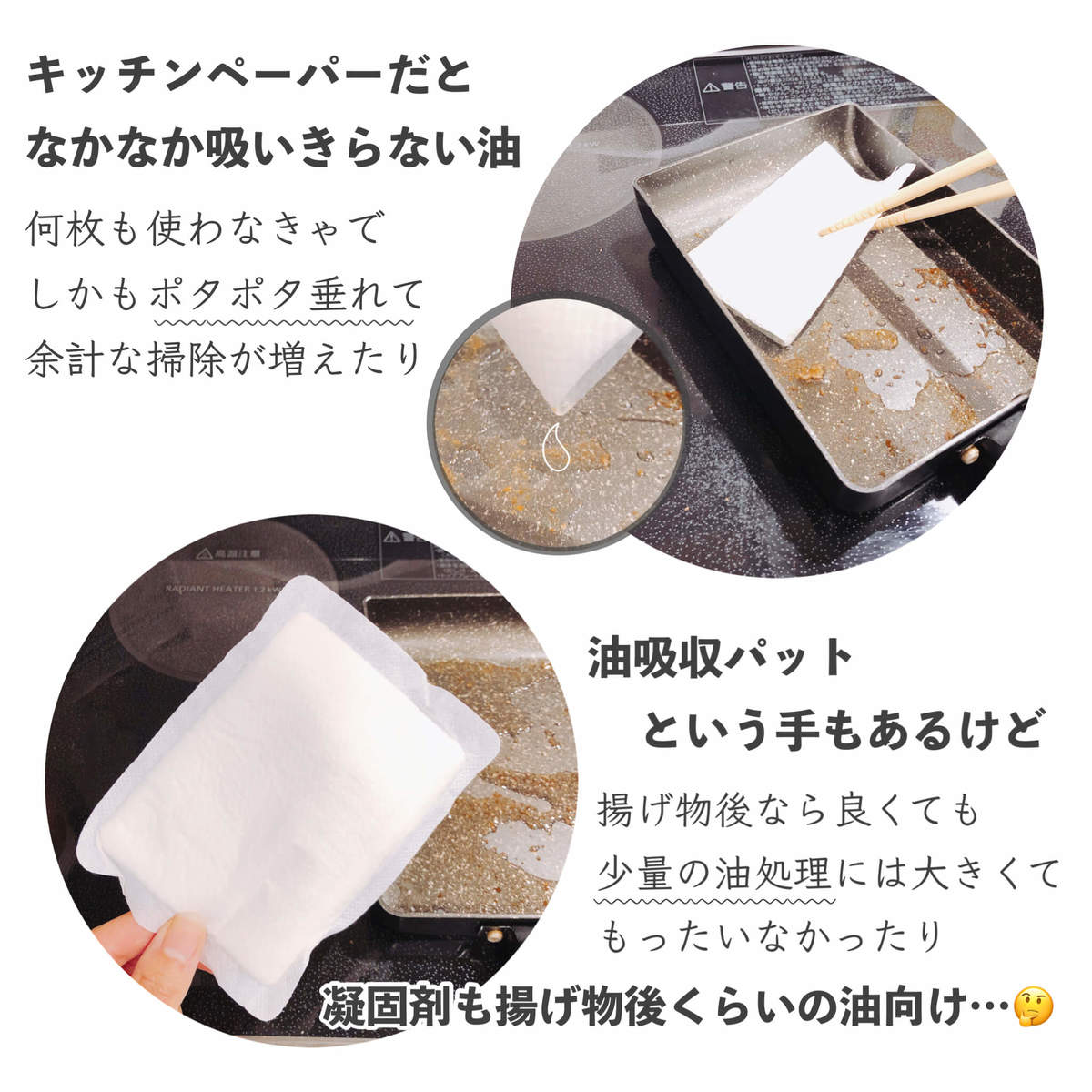 これまで油の処理にはキッチンペーパーなどを使用していましたが、何枚も必要になったり、なかなか吸いきらない油が捨てる際にポタポタ垂れて余計掃除が増えてしまったり……。