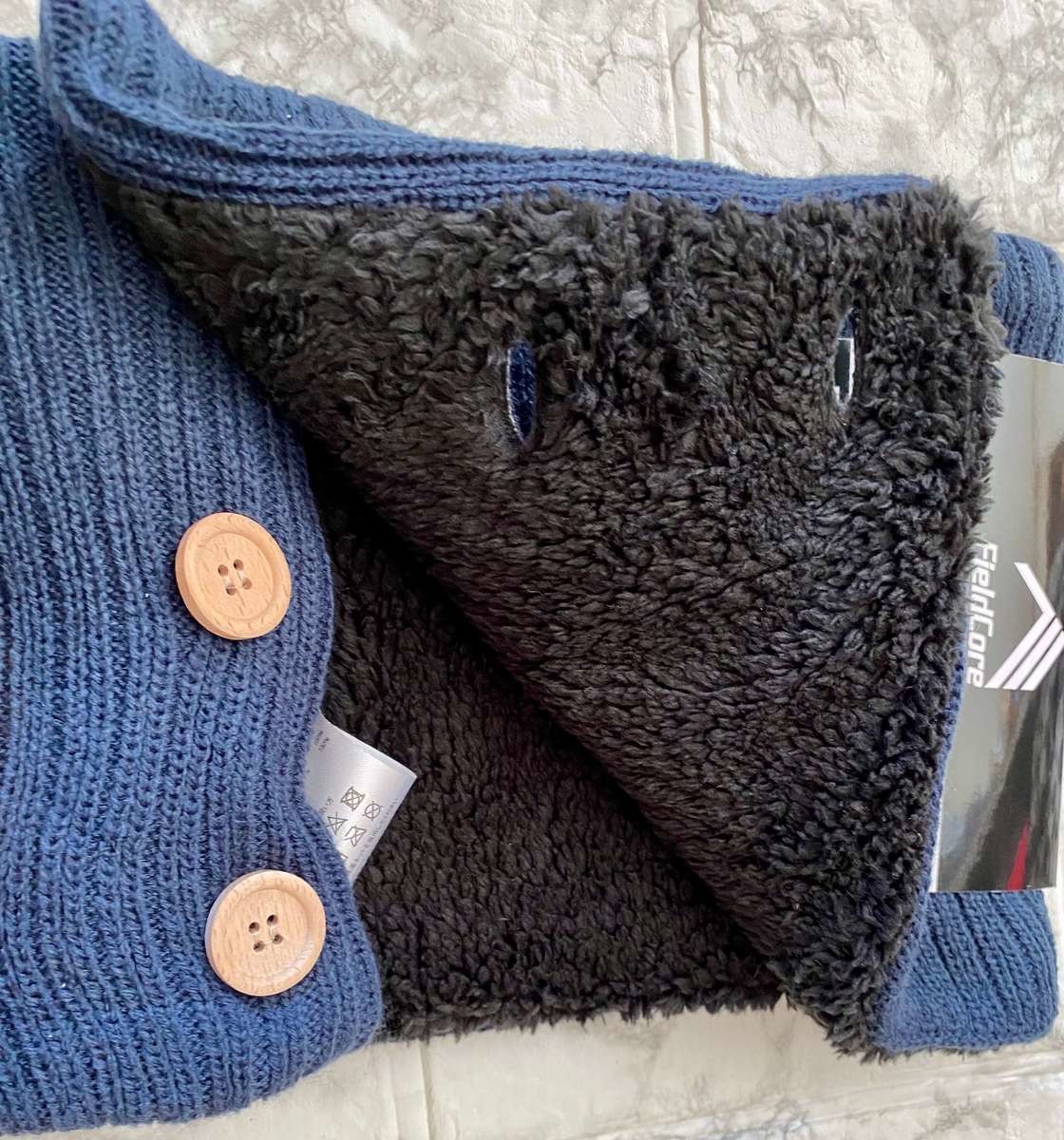 裏面はボア生地が使用されており、保温性は抜群!ボタンが付いているため、頭から被ることなく着用できますよ。