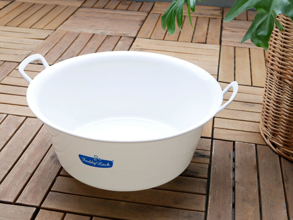 1つ目は、ベルリンと東京に実在するカフェ&コインランドリー【FREDDY LECK】より。清潔感あるホワイトに、上品で爽やかなブルーのロゴがアクセントで底面サイズは直径29.5cmと靴洗いやつけ置きにも便利です。