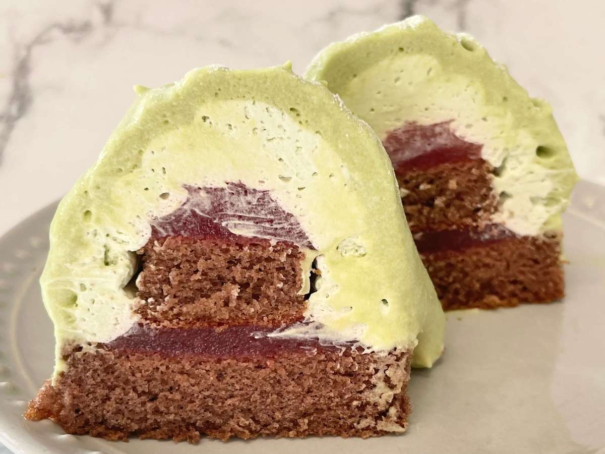 ココアスポンジに甘酸っぱいベリーソースを重ね、ピスタチオホイップクリームとピスタチオモンブランクリームが絞られたモンブランです。