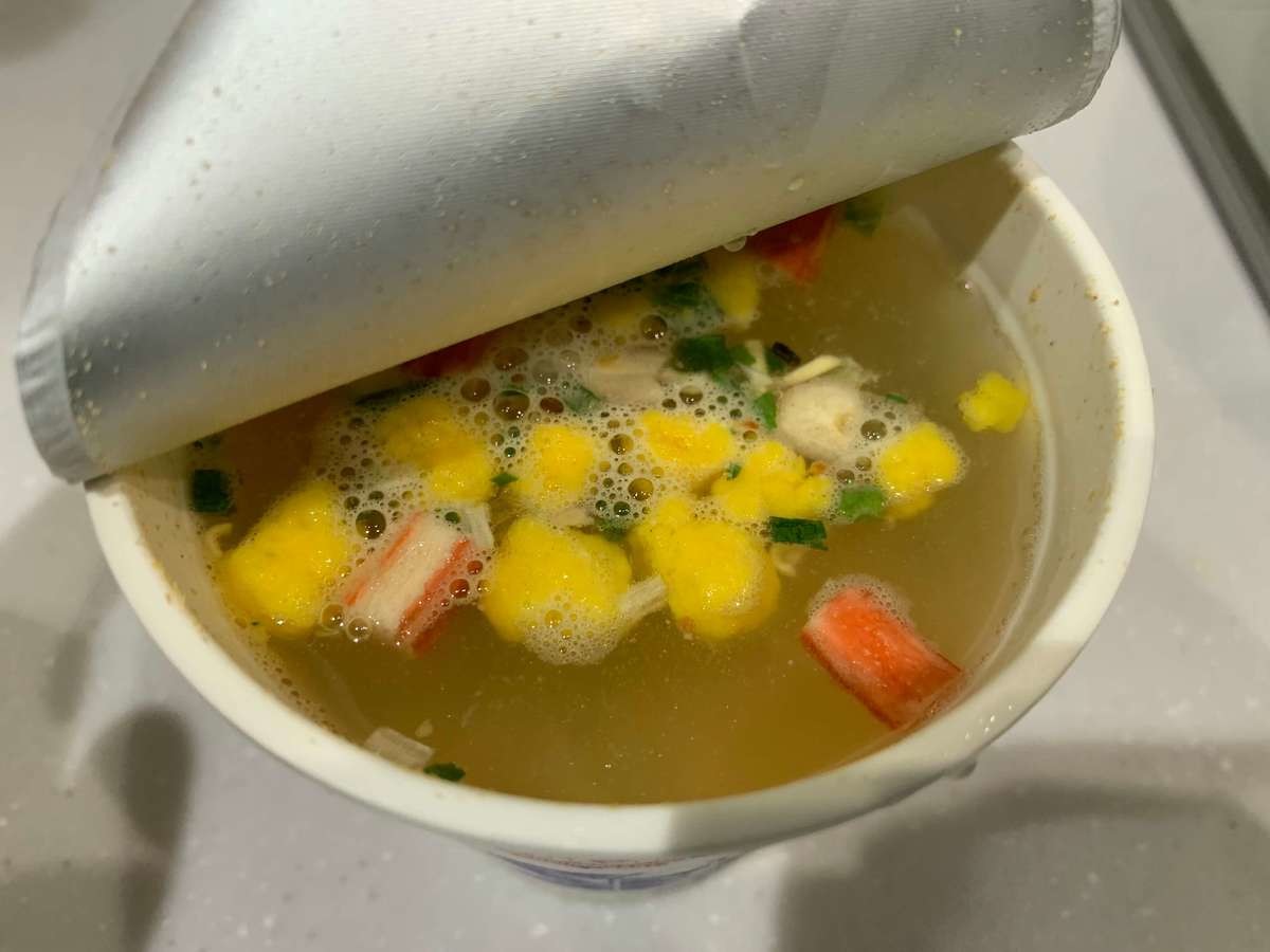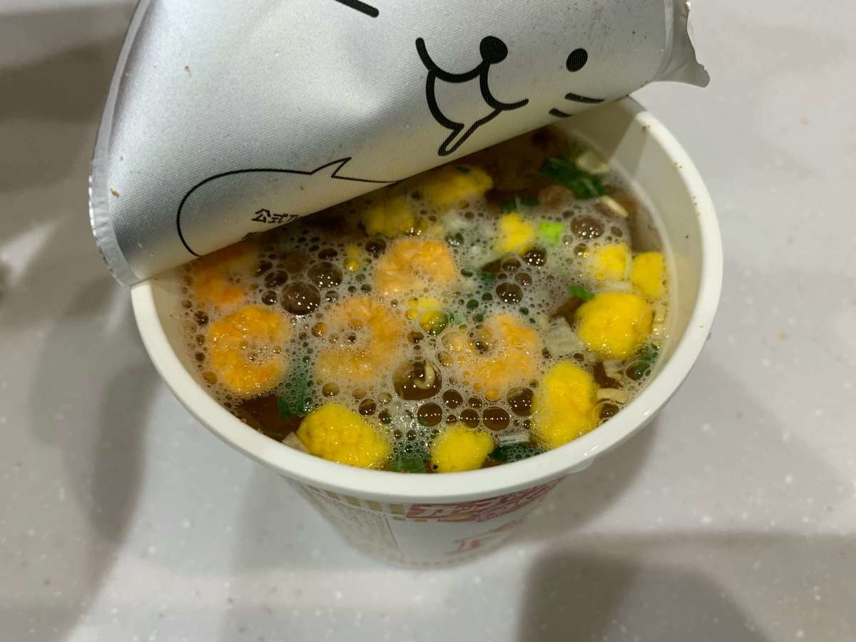 和風だしを既定の線まで注いだら、フタをして3分待ちます。シーフード味だと、どう変わるのか楽しみです。