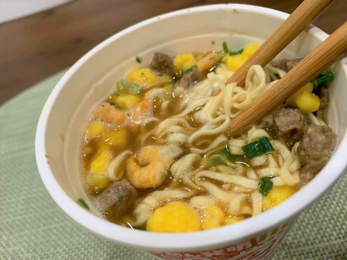 食べてみると、いつものシーフードヌードルと味は変わりません。でも、後味が全く違います。まろやかなだしの旨みがふわっと口の中に広がりました。