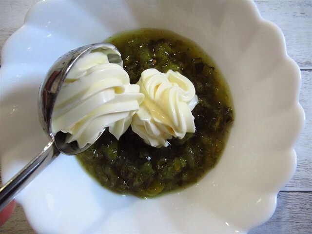 レリッシュとマヨネーズを混ぜてタルタルソースを作る