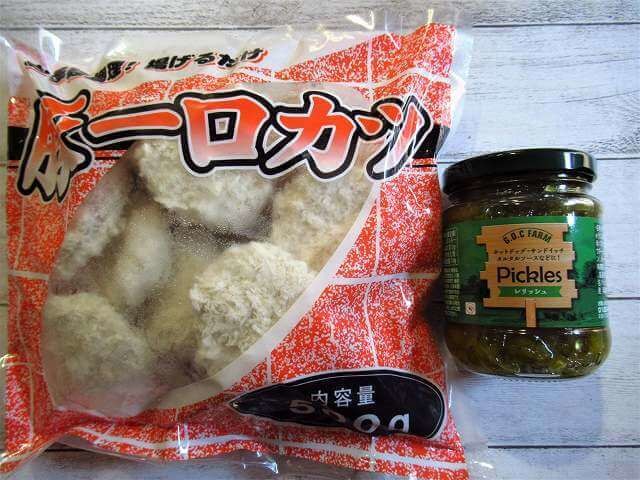 今回、主に使用するのは業務スーパーの「豚一口カツ」と「レリッシュ」。価格は豚一口カツが451円(税込)、レリッシュは167円(税込)です。