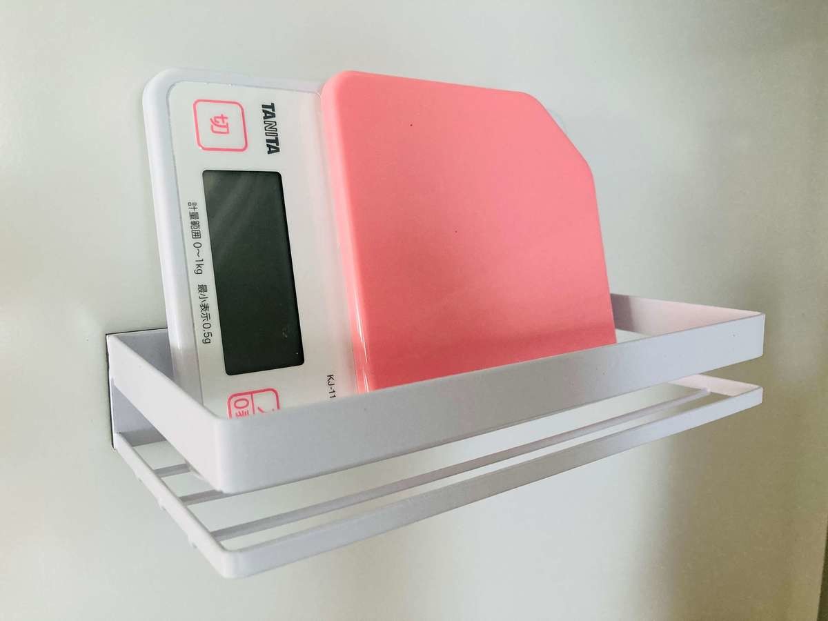 実際に冷蔵庫に付けてみると、「バチン!」という音とともにくっつきました。耐荷重が1kgもあるので、ある程度重みがあるものも安心して乗せられます!キッチンスケールを乗せてみても、びくともしません♪