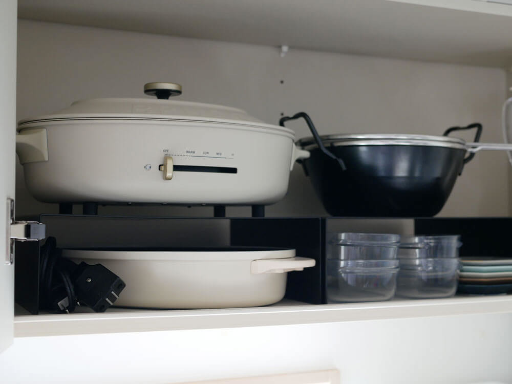 ラック収納部には、調理家電の付属品やセットで使う取り皿や大きいプレートなどを入れておけば、セットで使いたい時に便利ですね。