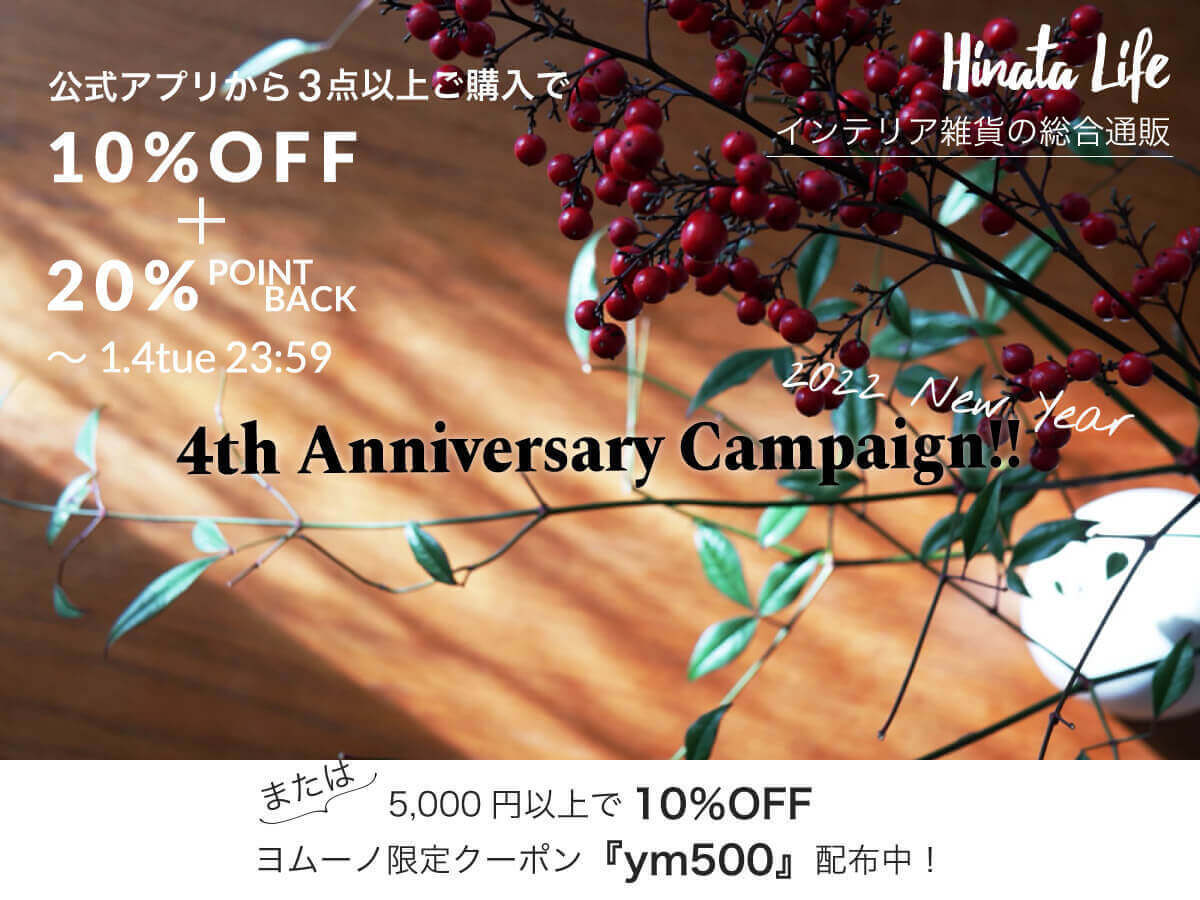 ⇒ひなたライフ公式アプリ限定3点以上のまとめ買いで10%OFF&ひなたライフ会員ポイント20%バック!または5000円以上で10%OFFコード「ym500」配布中!