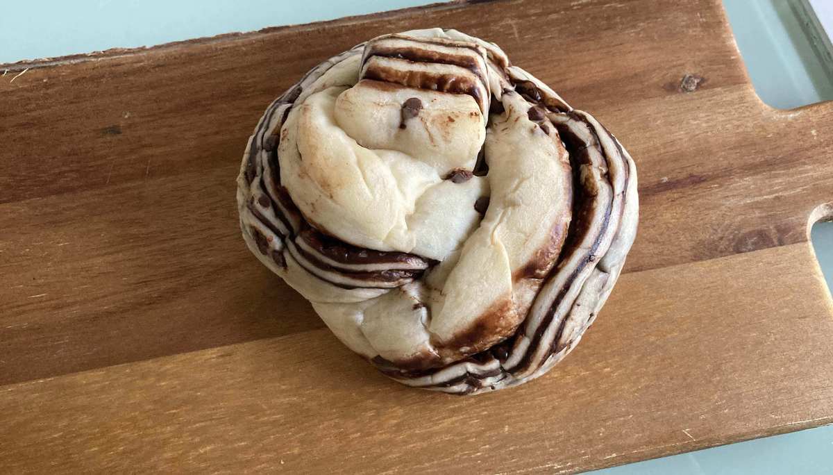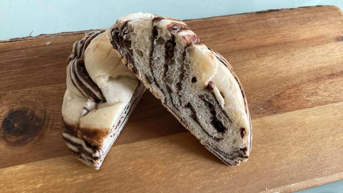 確かに触った感じもモチモチ!切る時もモチモチにナイフが負けてしまうほど、良い感じの弾力がありました。チョコの層がたくさん見えているのでチョコ推しなんだろうなぁ〜と思い一口パクリ。 食べてビックリ。チョコ推しではなく、“全体的にまとめられたパン!”というのが第一印象でした。