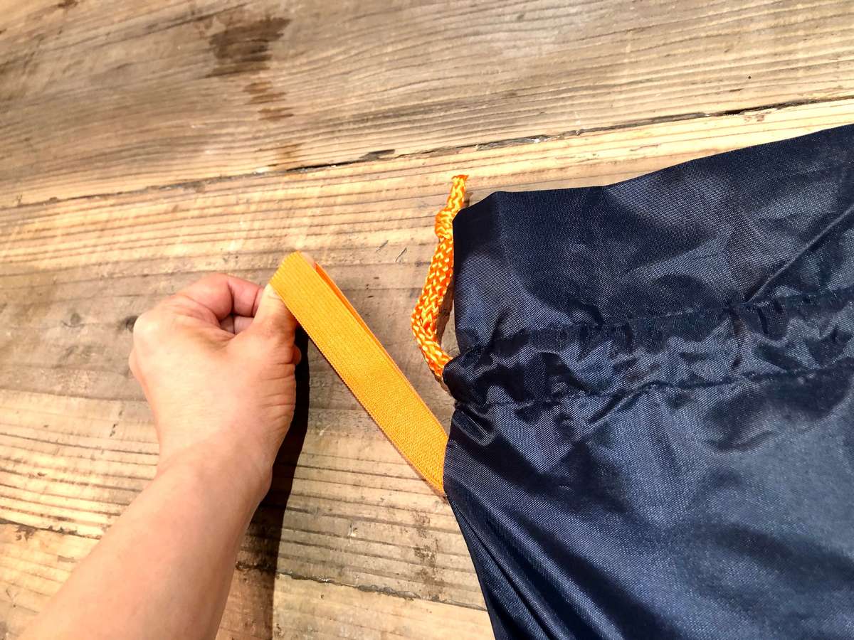 さらに、袋の横にはオレンジのゴムがついています。 これもエコバッグを留めるときのもの。バッグをコンパクトにまとめるために、ついています。バッグをくるんとオレンジのゴムで留めます。