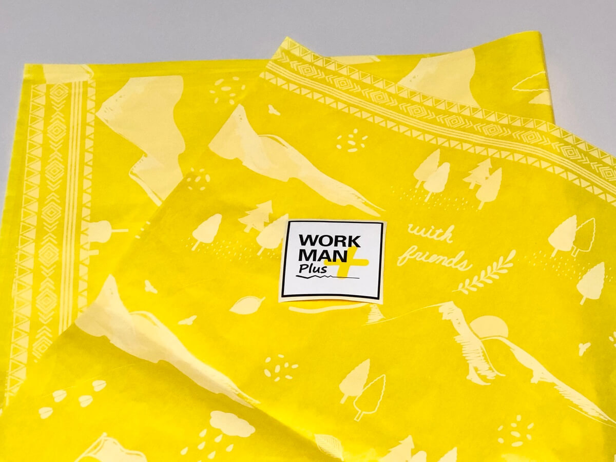 これまでもワークマンにはラッピングバッグがあったのですが、目を引く黄色いカラーの袋でした。 木や山から覗く太陽、雲や雨など自然をイメージする図柄が書かれています。