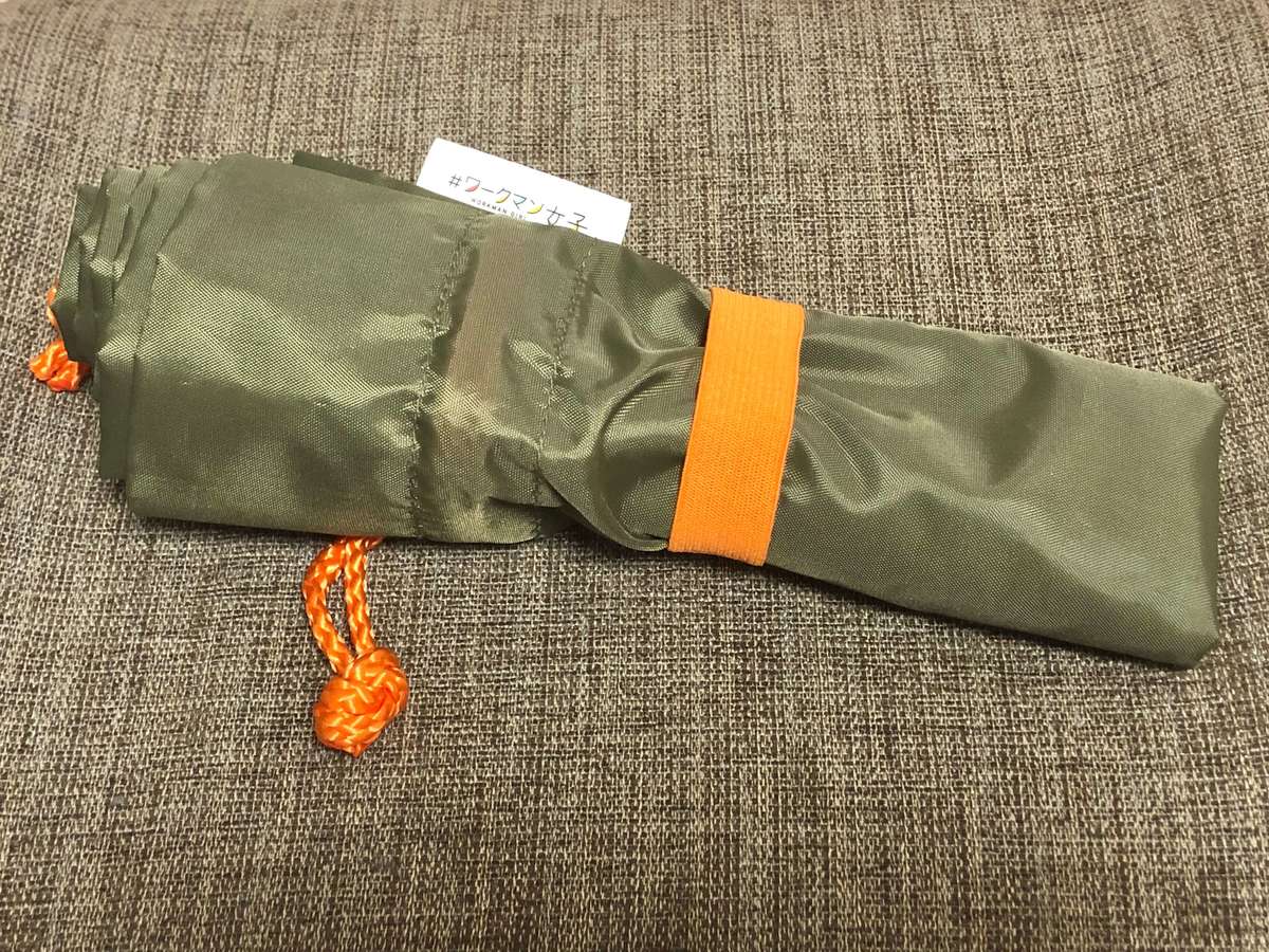 また、ゴムを使って留めるのはとても可愛くて鞄のなかでオレンジの姿を見るたびにちょっとテンションが上がります。 そして意外にもゴムを使わずにそのまま4つ折りにして入れることも多かったです。取っ手が内側に入り綺麗にたためるので、ふつうに4つ折りにしてもスリムに収納できました。