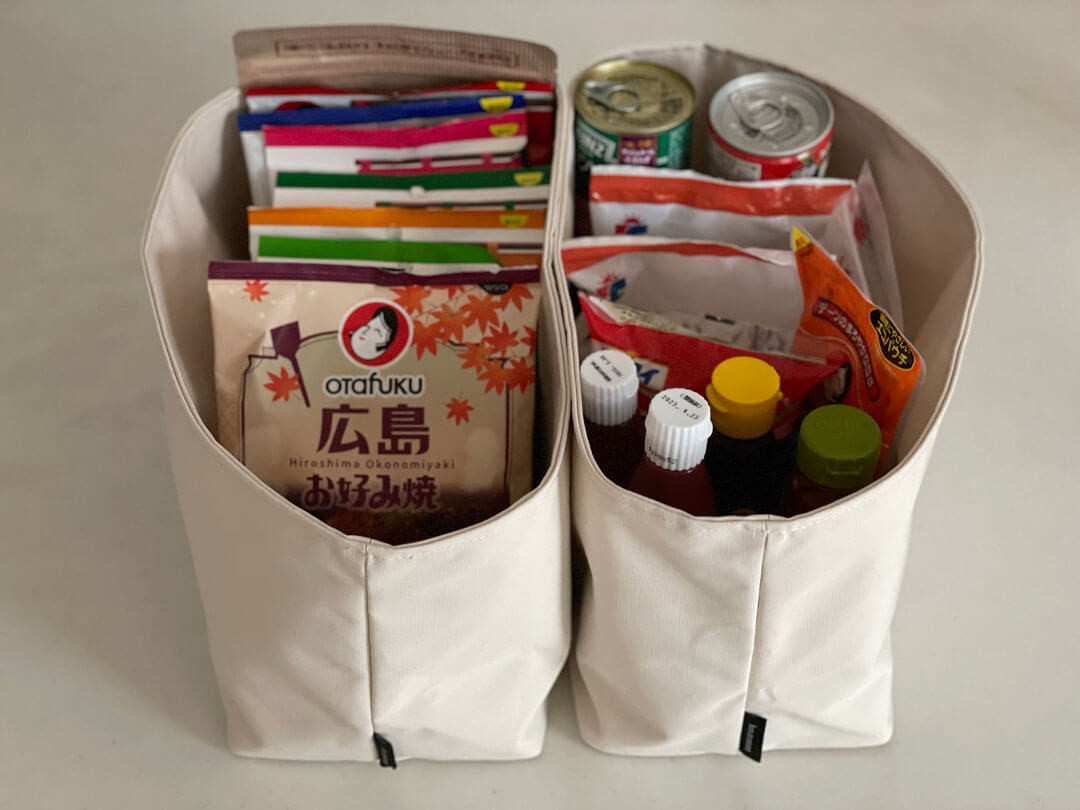 「bon moment 高さが調節できる収納」Mサイズを2つ使って、食品を立てて収納します。