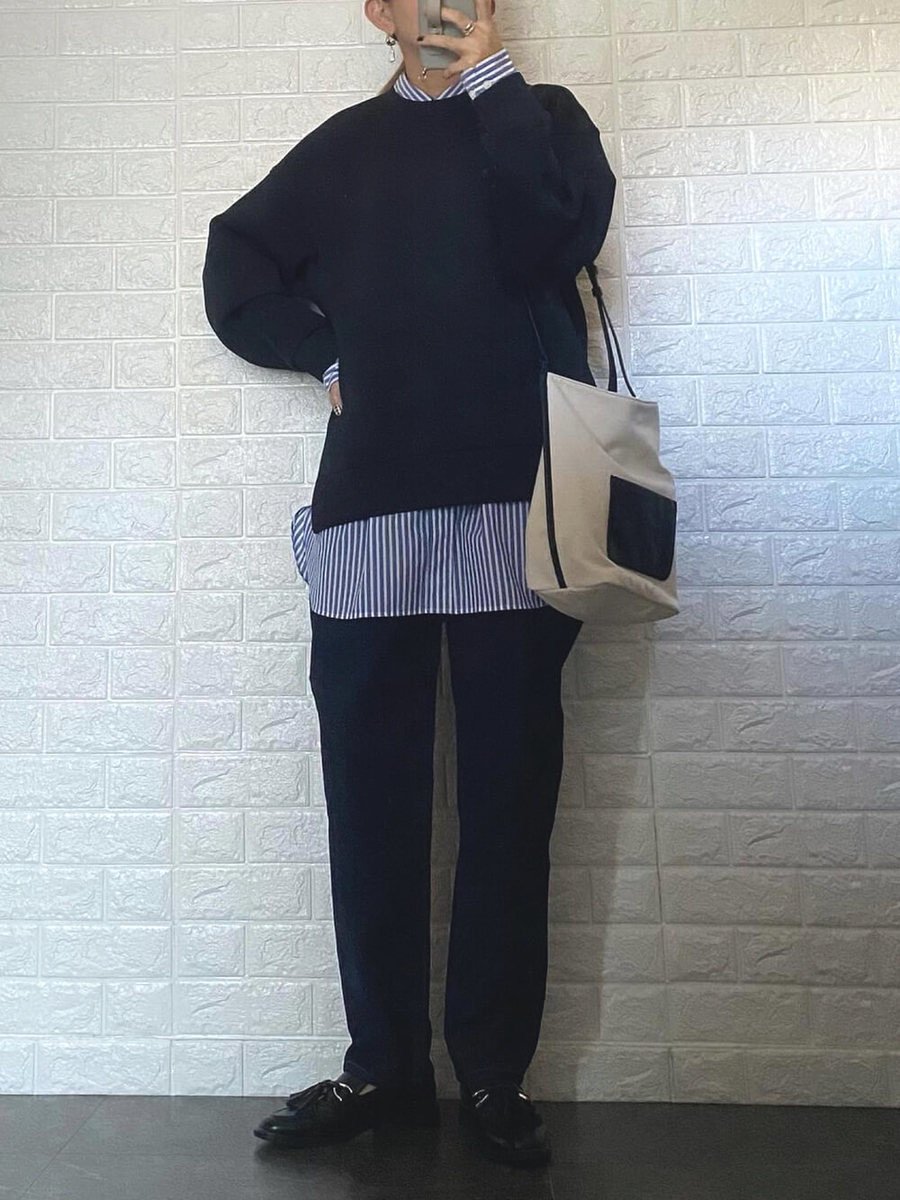 ネイビー×ネイビーのスウェット×ブルーのストライプシャツ