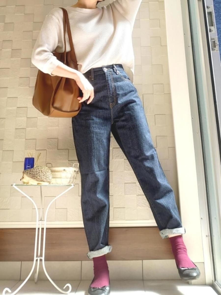 ユニクロの「ペグトップハイライズジーンズ」は裾に向けてゆるやかに細くなるテーパードシルエットで、脚がすっきり見えします。加えて、ハイライズだから脚長効果もバッチリです。
