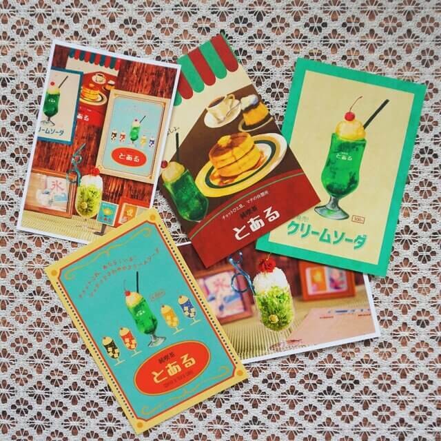 こちらの商品は、メロンソーダとパンケーキやプリンデザインの3枚+写真2枚のお得なセット。ポストカードの裏には郵便番号欄も印刷してありますよ。写真は普通のクリームソーダではなく、お花でデザインされているので細かいデザインにも注目してみてくださいね。