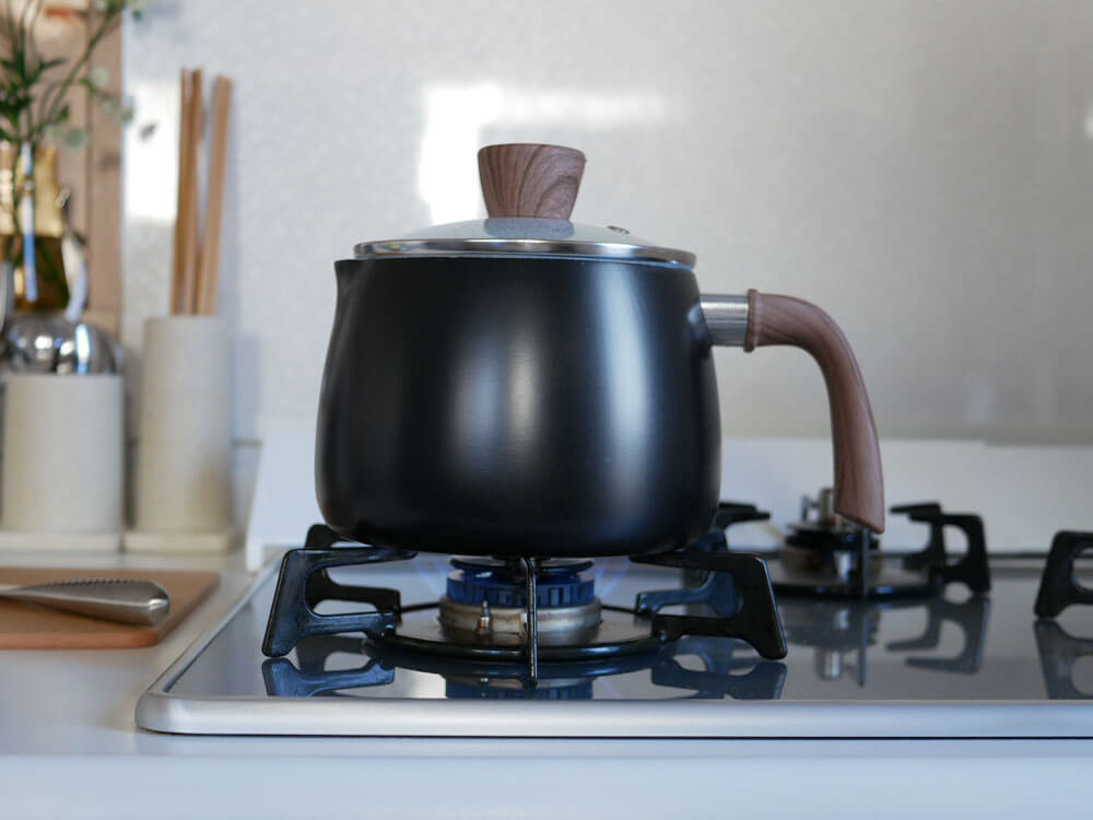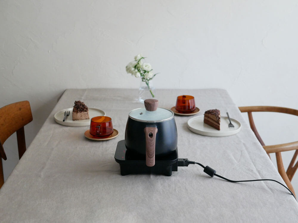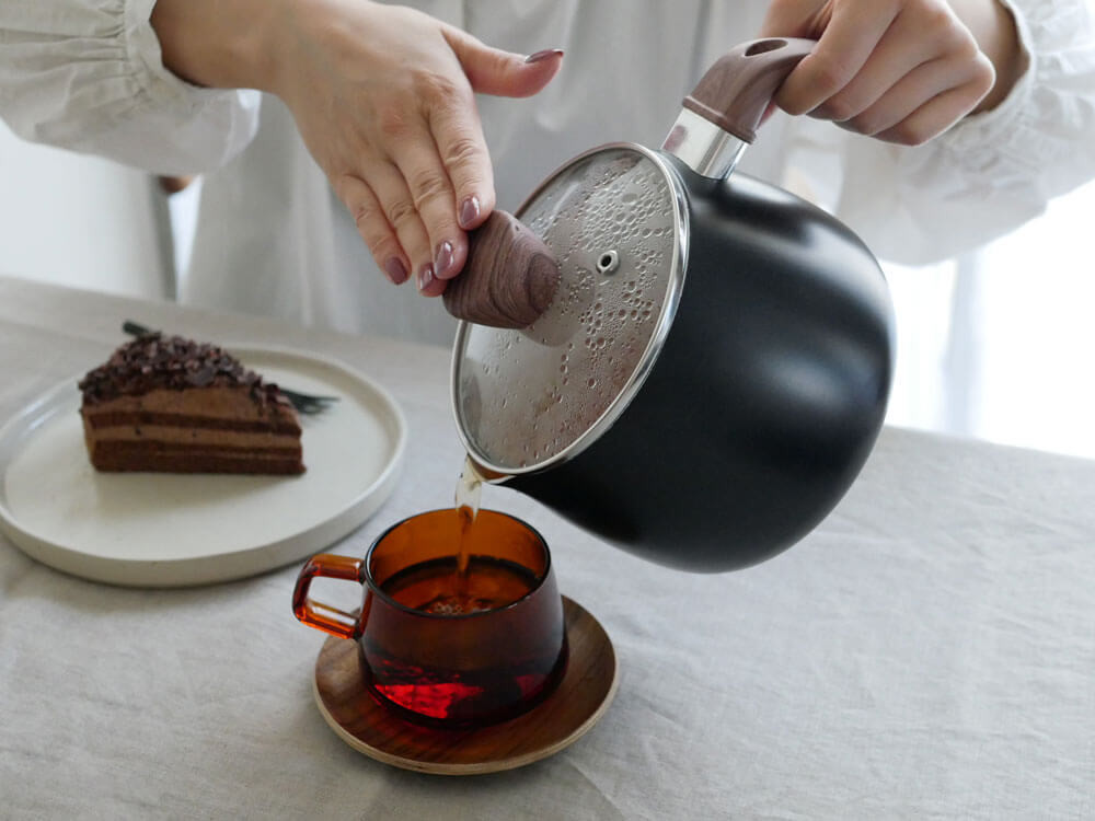 容量1.9L(実用量1.3L)入る小鍋なら、ティータイムにも最適。 来客時にお話を遮ってキッチンに立つ動作もなく、その場で適温をサーブできますね。