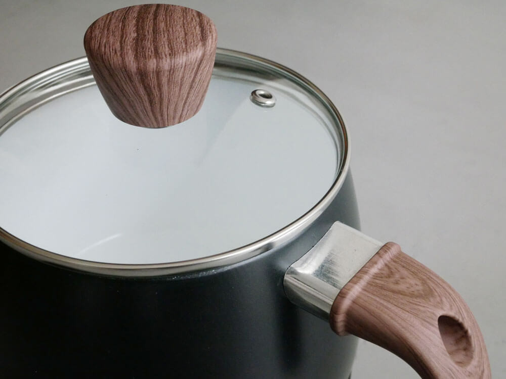 セミマットで高級感のあるブラックカラーの本体は、アルミニウム合金で塗装加工(外面:焼付塗装加工、内面:セラミック塗装加工)もされており、蓋は強化ガラス製なので、丈夫で長持ち、そしてお手入れもしやすいのがGOOD。
