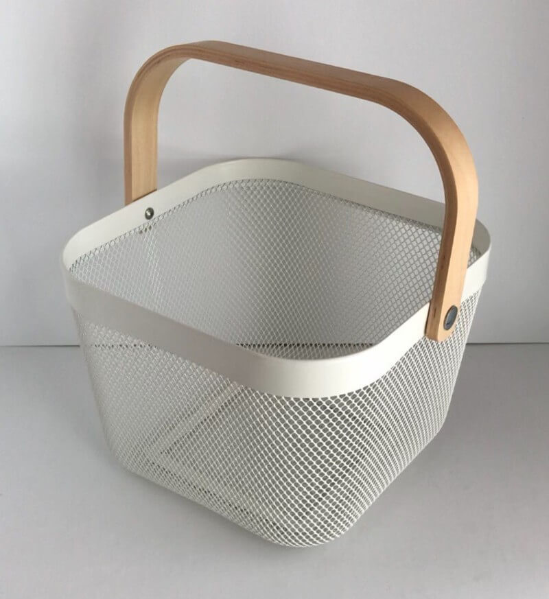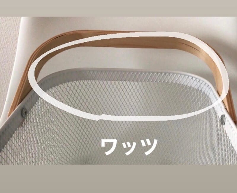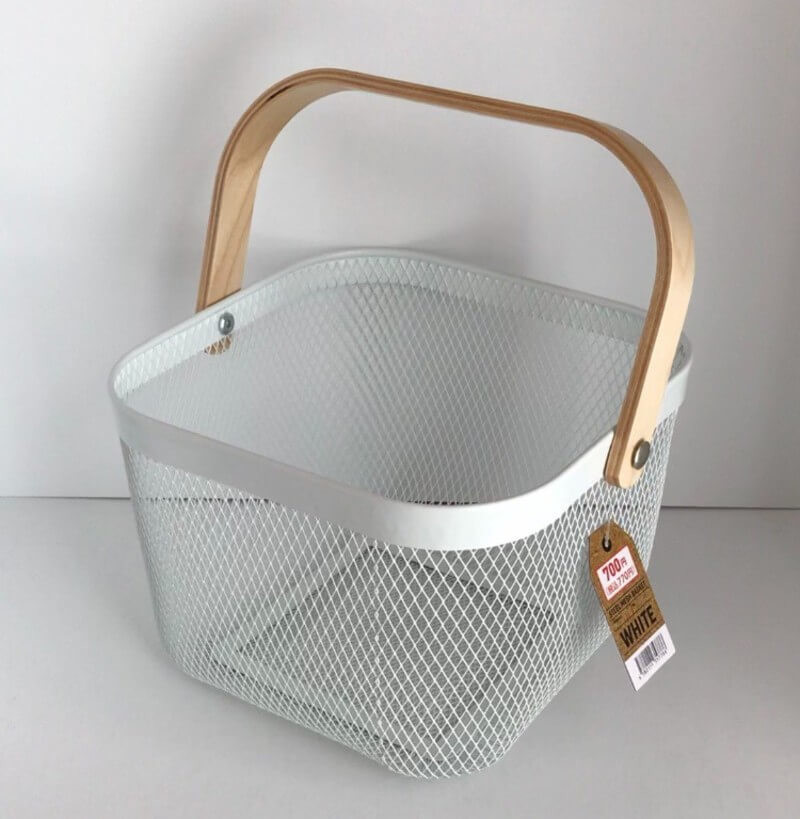 スチール素材のメッシュカゴと天然木の持ち手がシンプルで何ともおしゃれな組み合わせですよね!