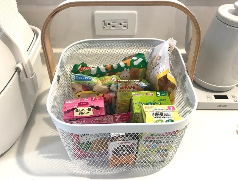 キッチンでは娘の離乳食グッズを入れています。散らかりがちな細かいおやつなどをスッキリとまとめることができます。