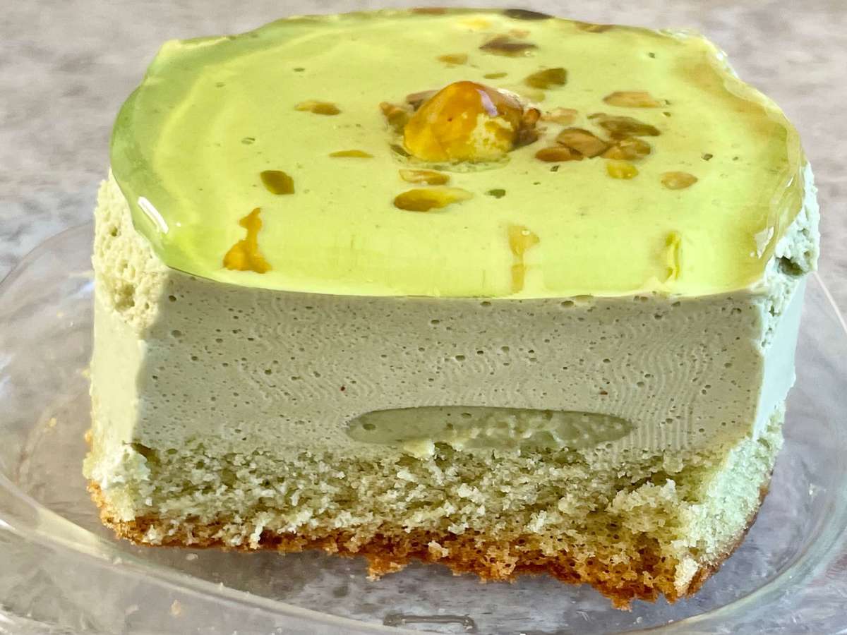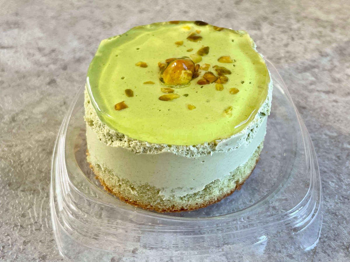 スポンジ、クリーム、ムース、トッピングまでピスタチオがたっぷりと使われています。上から下までピスタチオだらけ!