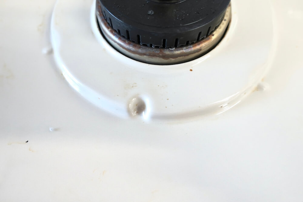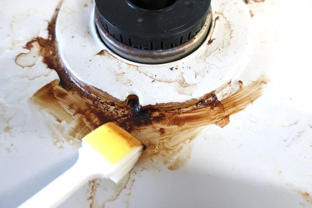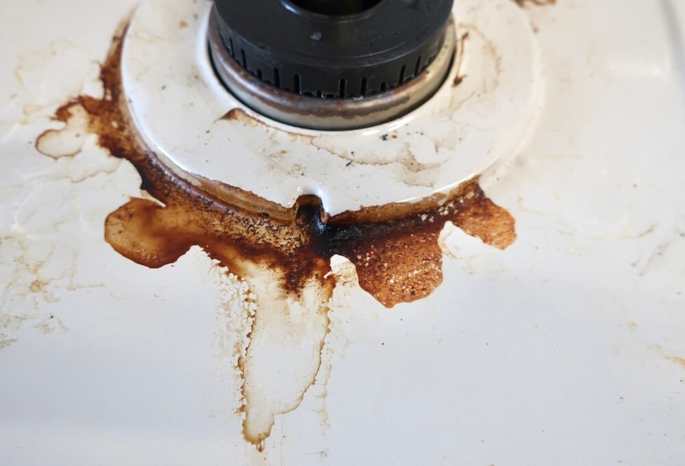 今回は、鍋やフライパンの焦げ付きを落とすという「サビ・コゲ落としスティック」を使って、コンロ周りをキレイにしてみます。焦げ付いてしまった吹きこぼし、2〜3日放置してしまっていたんです……