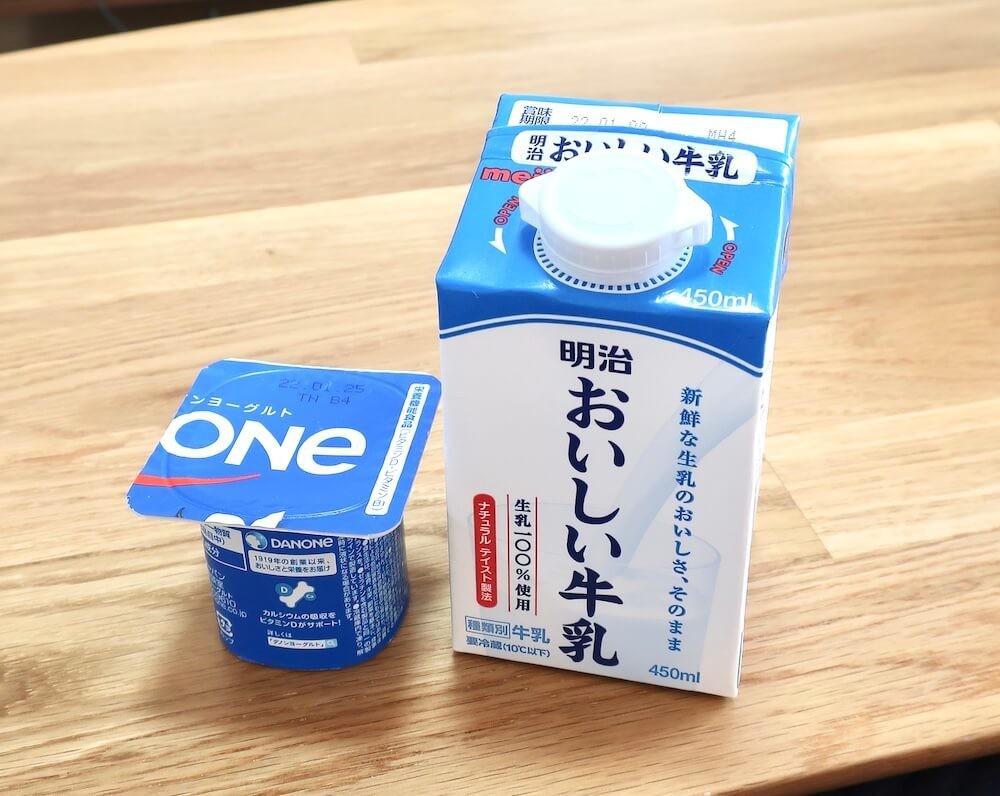 用意するものは、種菌にしたいヨーグルトと牛乳の2つだけ!牛乳は乳脂肪分3.5%以上の、新鮮なものを使ってくださいね。牛乳は室温に戻し、冬場など部屋が寒い場合は一度20〜20℃に温めておきます。ヨーグルトの指定はありませんでしたが、プレーンタイプのものを使う方が良さそうです。
