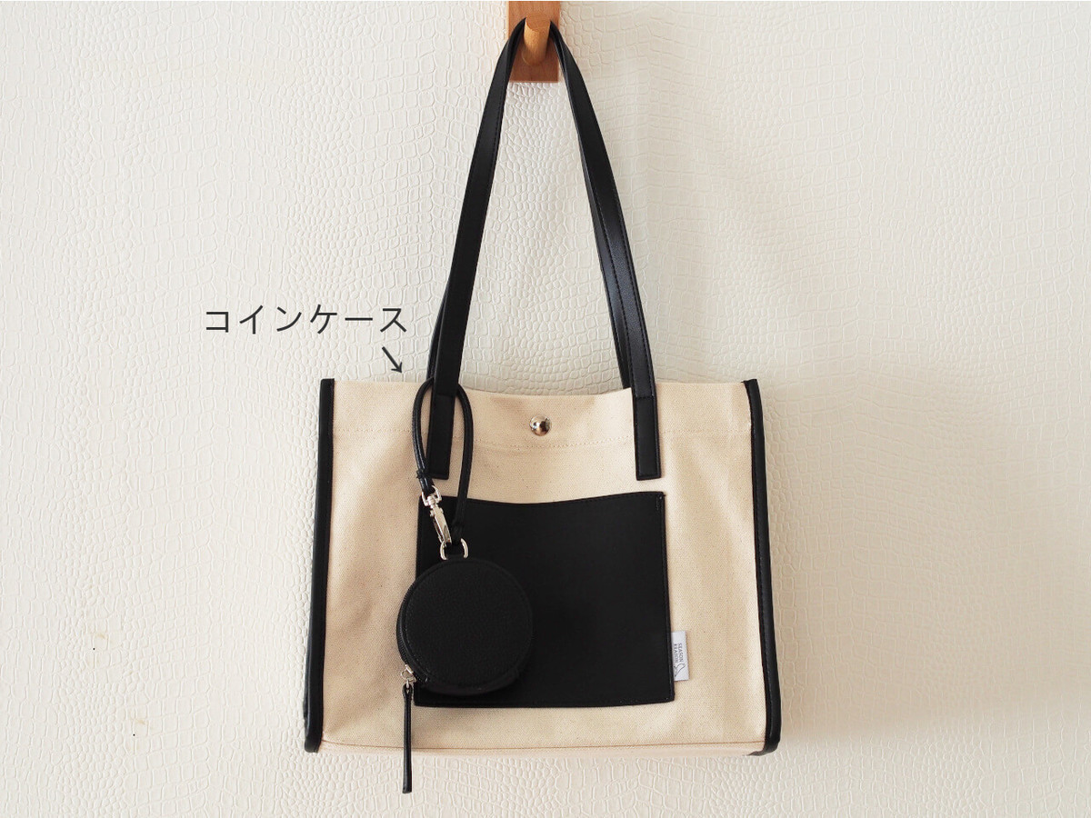 円形のコインケースは、キャンバスバッグとスクエアバッグに、アクセサリー感覚で付けて使うことができます。