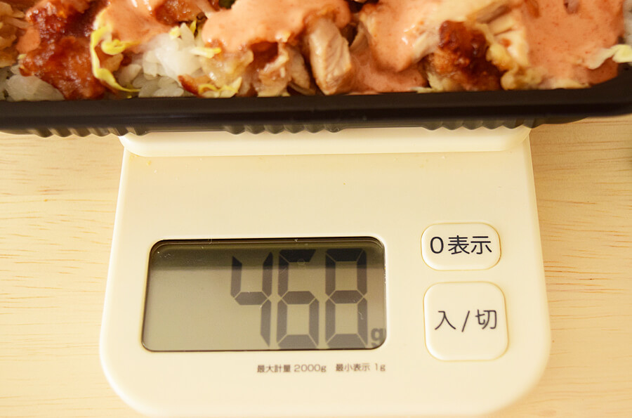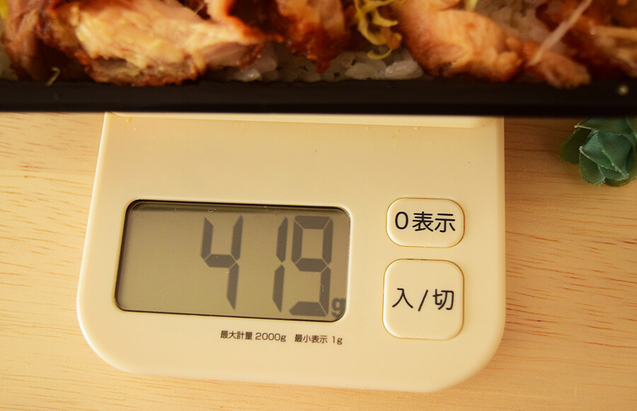 お弁当の重さは、419g(容器込み)。ひとりで食べる分には、過不足のないお弁当でした。