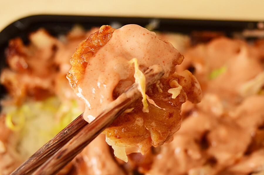 サーモンピンクのケバブソースがかかってますね。ソースの下は、カットされている唐揚げでしたよ。