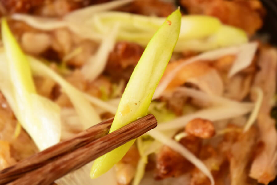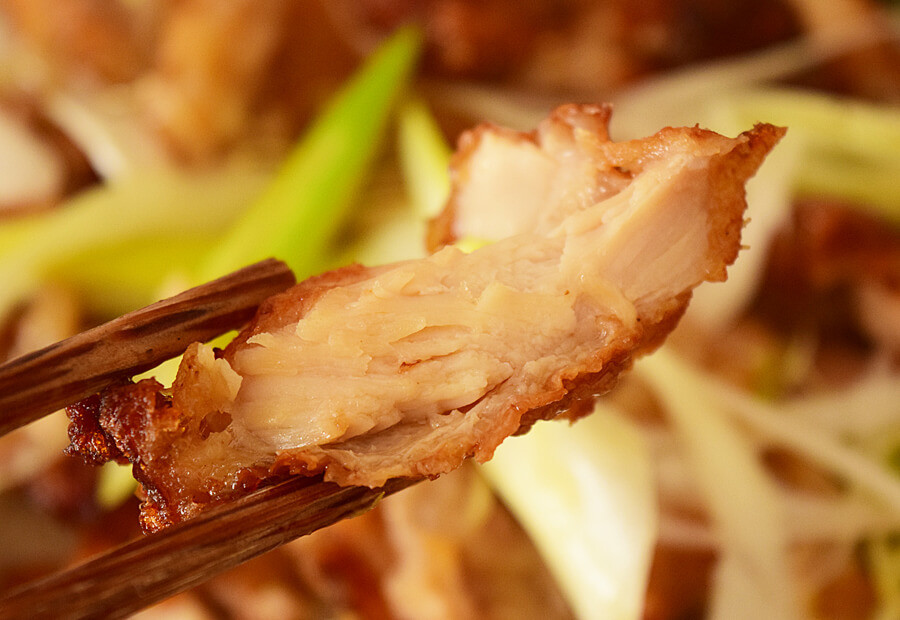 矢切ねぎの下には、細かくカットされている唐揚げ。ほどよく醬油ベースで味つけされている唐揚げと甘みと苦みが同居している矢切ねぎとのコントラストが良いですね。