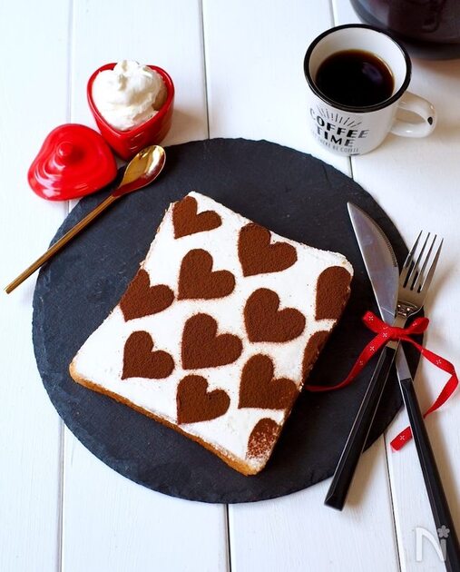 見た目も可愛すぎるハート模様のデザートトースト♡クリームチーズ・ハチミツ・ココアパウダーを使ったティラミス風のお味で、ハート模様を上手に仕上げるコツも解説されています。