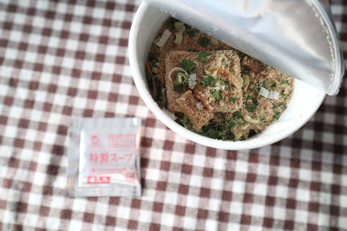内容は、麺はフライ麺。かやくは、ねぎ、メンマ、フリーズドライのチャーシューブロックです。直前に入れる後入れ調味料もついてきます。