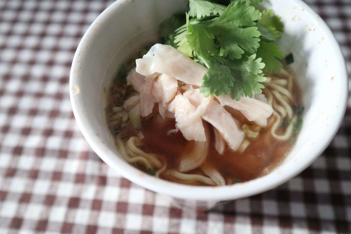 サラダチキンとパクチーをトッピング。辛みが大丈夫な方は、ラー油をちょい足しするのもおすすめです。パクチーの爽やかさとサラダチキンの食べ応えが加わり美味しさ増し増しです。