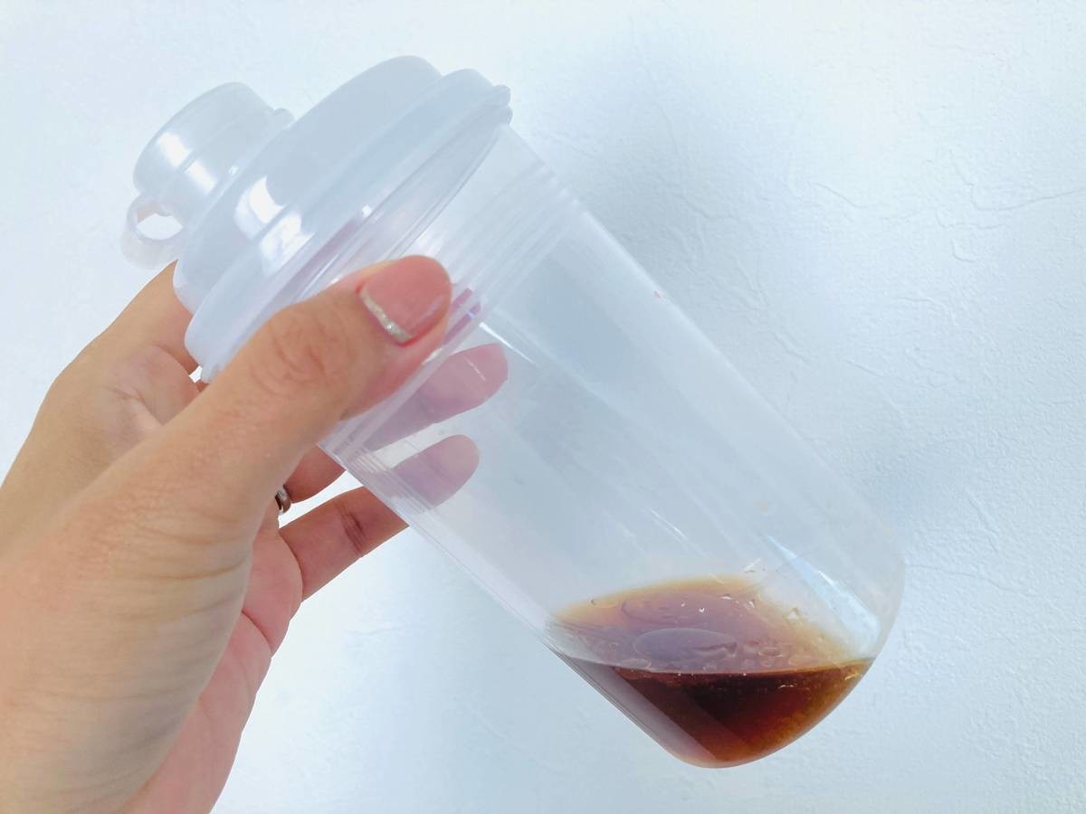 試しにドレッシングを作ってみました。必要な調味料を入れたらフタをしてシェイク!たったの30秒でドレッシングが完成しました。